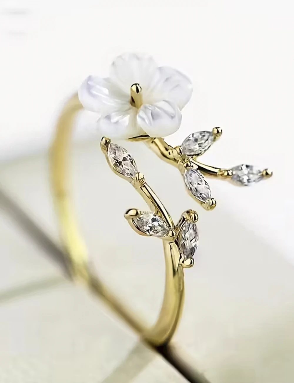 Anillo ajustable de diseño floral elaborado en cobre de alta calidad, adornado con una delicada hoja y una circonita cúbica sintética que aporta brillo y elegancia.