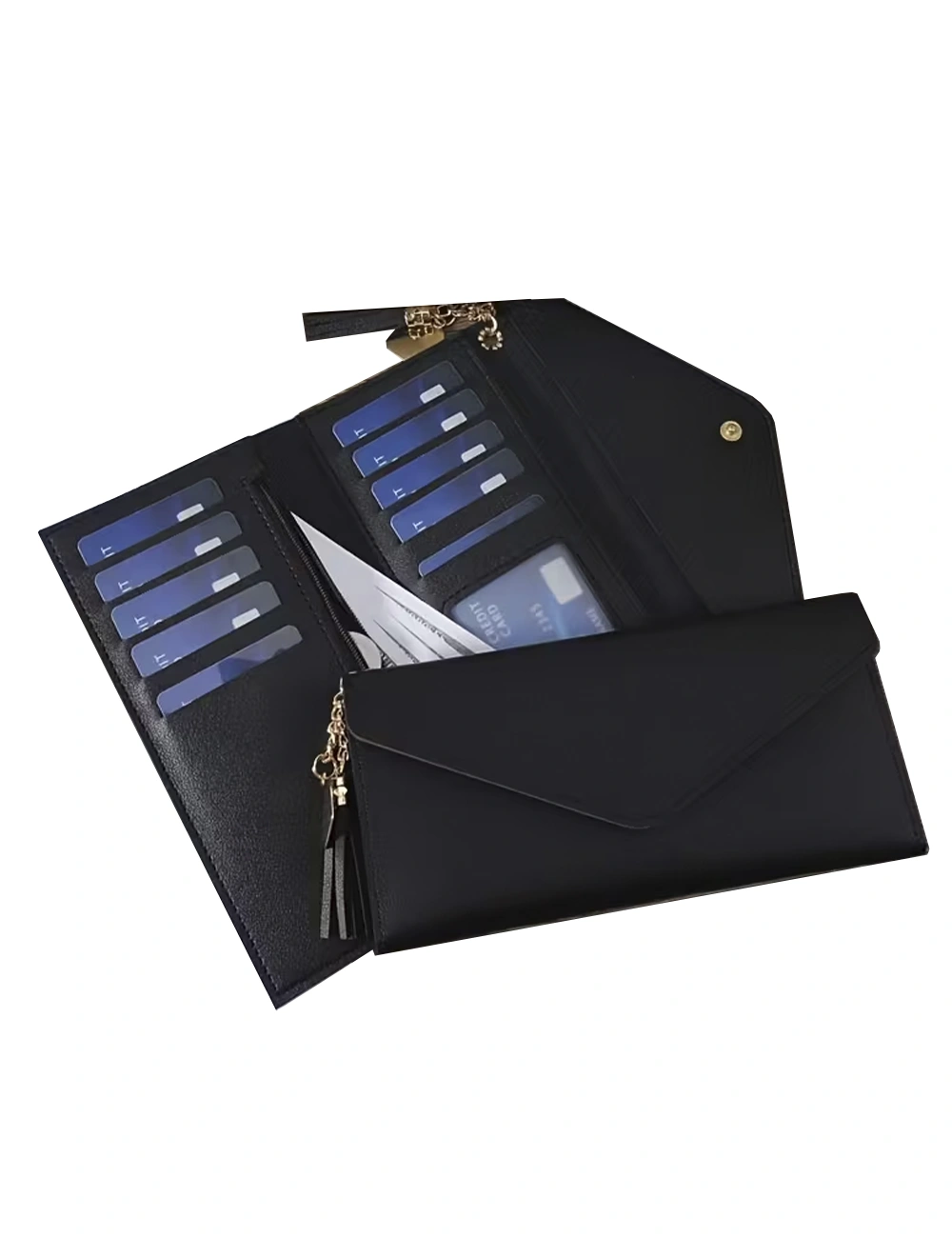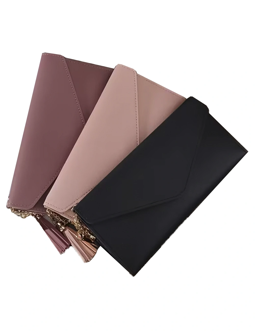 Cartera elegante para mujer con diseño de triple pliegue, detalles decorativos de borla y dije en forma de corazón. Incorpora un cierre metálico dorado que realza su estilo moderno y sofisticado.