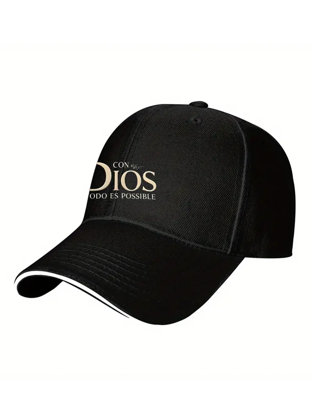 Gorra de béisbol “Con Dios Todo Es Posible”, confeccionada en poliéster transpirable de alta calidad. Su diseño en color negro con letras doradas ofrece un estilo elegante y moderno, ideal para actividades deportivas como fitness, running o para complementar atuendos casuales. Presenta una parte trasera de malla que favorece la ventilación y un ajuste cómodo para uso prolongado. Perfecta como gorra de pareja o accesorio de moda versátil, combina funcionalidad y mensaje inspirador en una sola pieza.