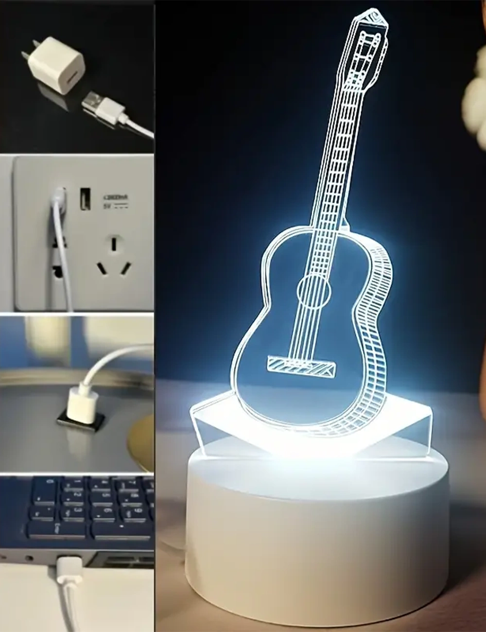 Lámpara decorativa LED 3D con diseño de nota musical y guitarra, ideal para crear un ambiente acogedor en dormitorios, salas o escritorios. Su luz multicolor ofrece efectos cambiantes que realzan la estética del espacio, convirtiéndola en una pieza moderna y funcional. Fabricada con tecnología LED de bajo consumo, es energéticamente eficiente y compatible con múltiples dispositivos. Gracias a su tamaño compacto y estilo artístico, es un regalo perfecto para músicos, amantes del arte o quienes buscan una iluminación distintiva. Aporta calidez, elegancia y personalidad a cualquier entorno con esta versátil lámpara de mesa enchufable.